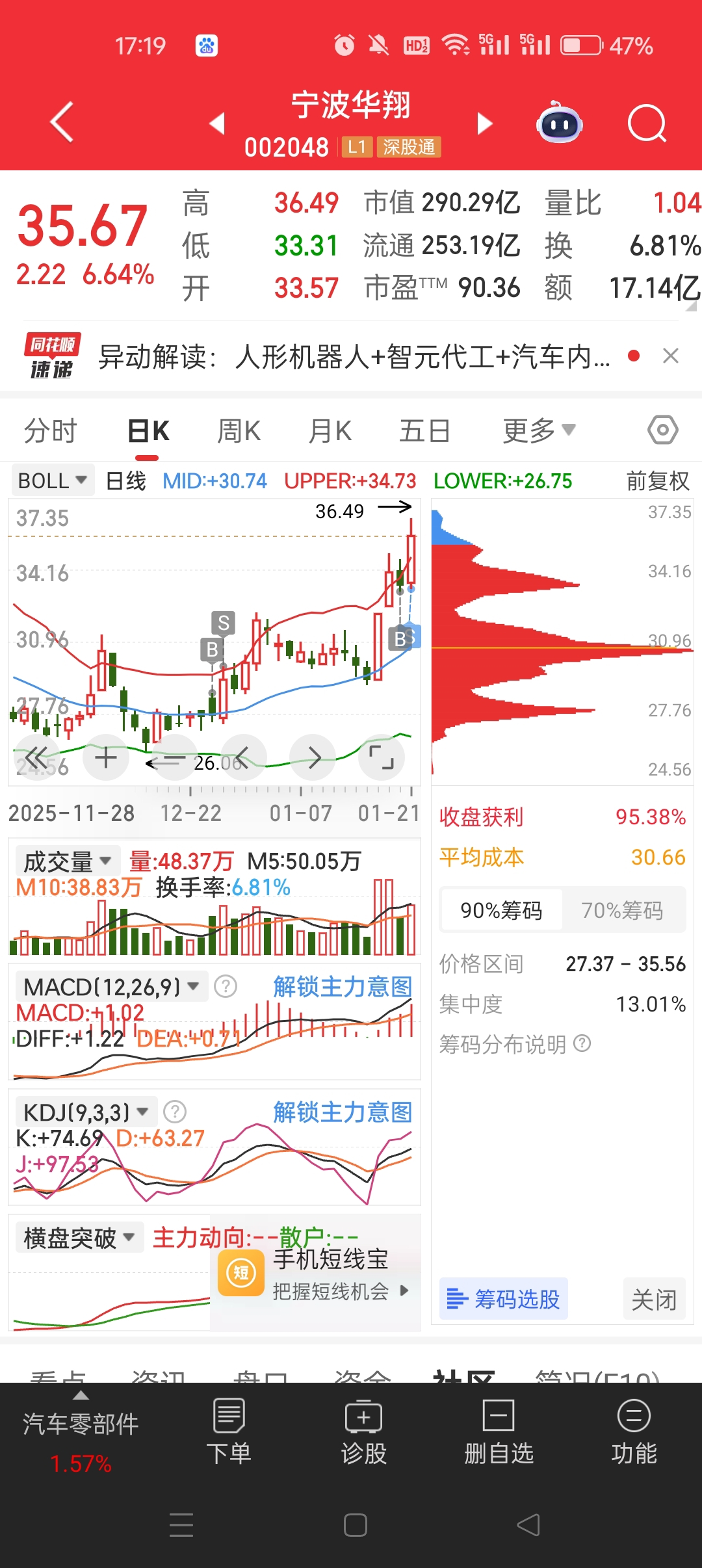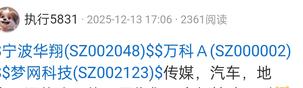 $万 科A(SZ000002)$ $宁波华翔(SZ002048)$ $梦网科技(SZ002123)$ 万科筑底最慢,华翔和梦网已经起来了,12月都是提了不止一次,华翔我自己就搞了两次也拿了14个点出来,走低位挖掘波段是不是也算一条不错的路子