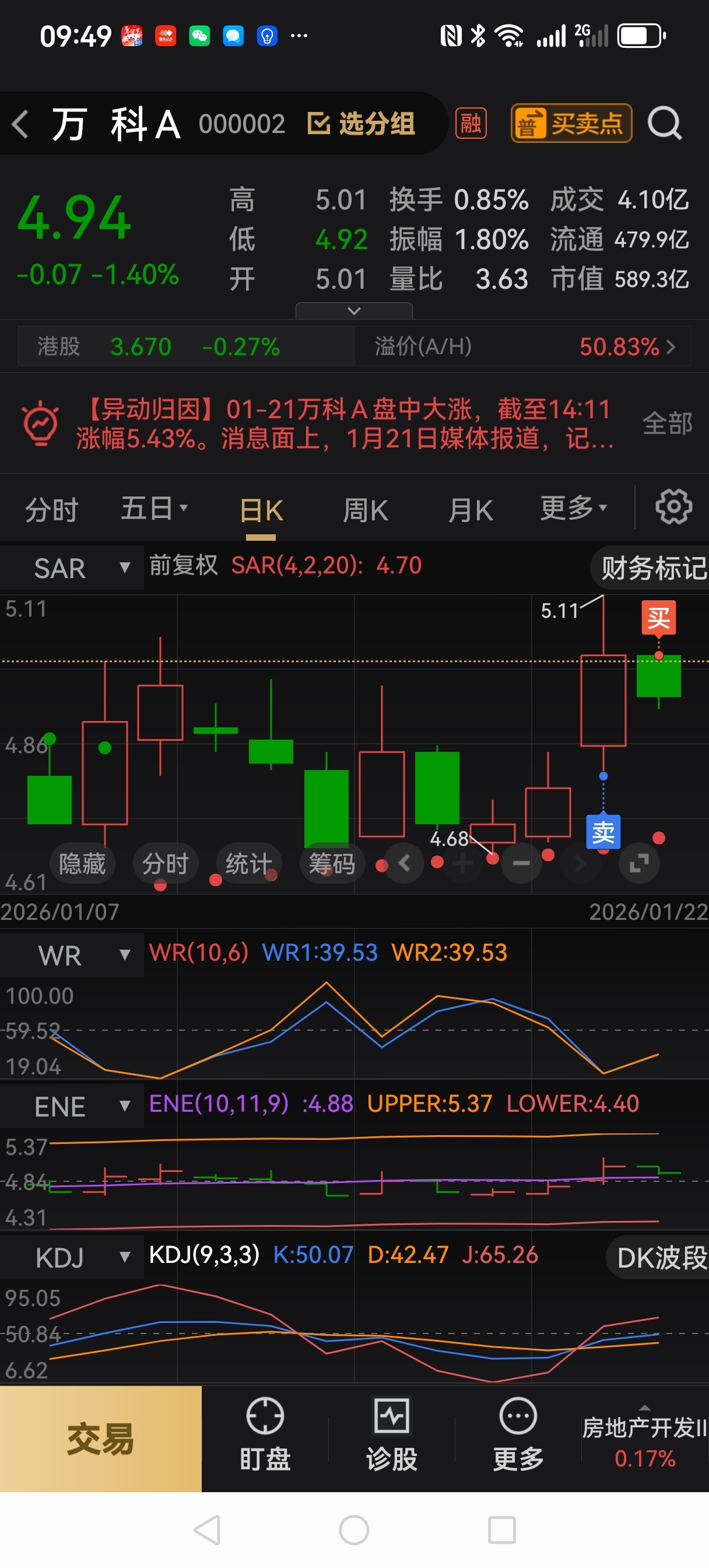 万科A,昨天清仓5.08,1月22号,已建仓4.95,不后悔。