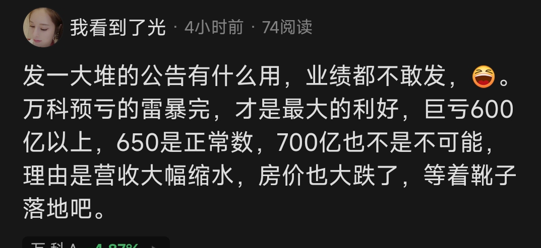 $万 科A(SZ000002)$ 万科是油脂票加散户,保利是散户加机构,蛇口是机构票,我一直说万科亏损600亿大底,650是正常,700也不是不可能,结果820亿,也是有点小意外,不过也正常,幼稚票嘛就是低开高走也不是不可能,地天也不是不可能,这里什么事都可能发生,清理小散,必须得,大雷暴了是好事,稳点的还得买保利