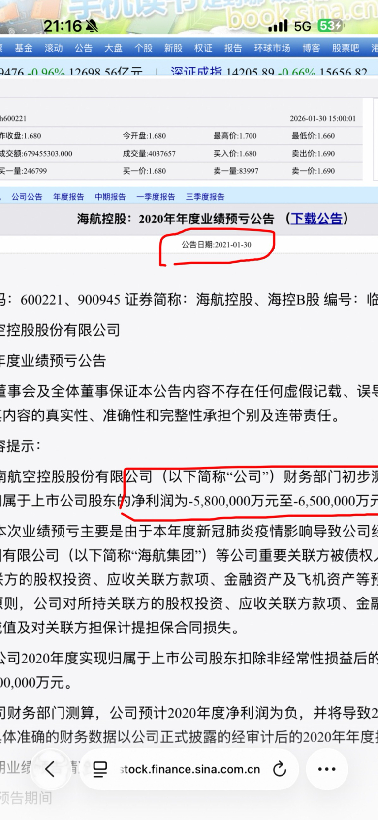 海航控股预公告巨额亏损后的市场表现。