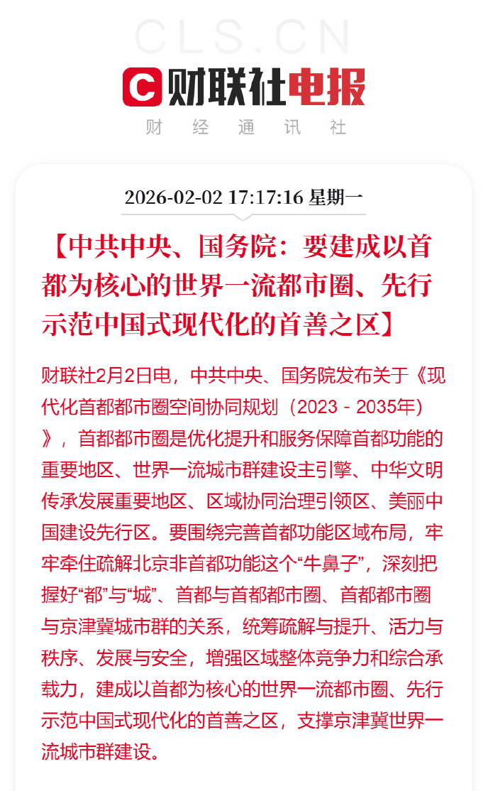 GWY批复同意《现代化首都都市圈空间协同规划(2023-2035年)》。其中提出,构建优化首都都市圈的圈层结构。建设京津、京雄走廊,梯次布局北京平原新城、北京生态涵养区、通勤圈、功能圈和产业协同圈。通勤圈要聚焦职住协同,健全同城化发展体制机制。严守北京市常住人口总量上限,推动北京中心城区功能疏解提升,发挥北京城市副中心示范带动非首都功能疏解和区域协同发展作用,加快北京平原新城承接中心城区适宜功能和疏解人口,提升北京生态涵养区首都生态安全保障功能。