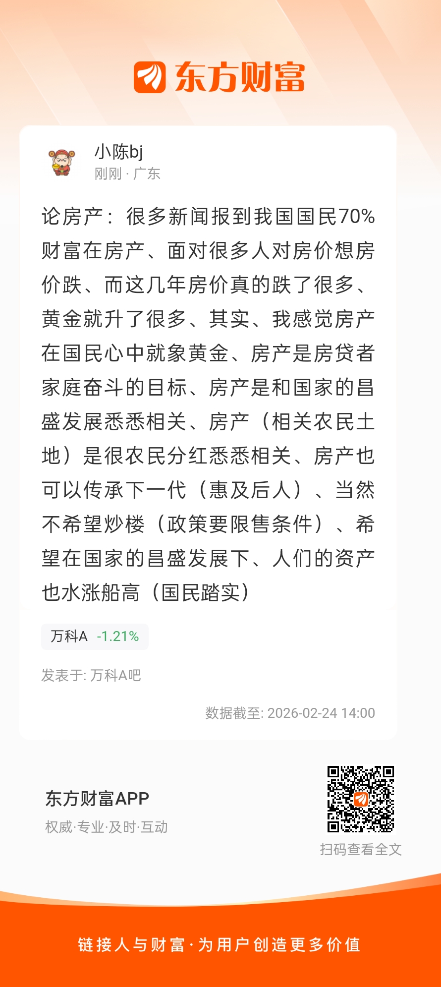 论房产:很多新闻报到我国国民70%财富在房产、面对很多人对房价想房价跌、而这几年房价真的跌了很多、黄金就升了很多、其实、我感觉房产在国民心中就象黄金、房产是房贷者家庭奋斗的目标、房产是和国家的昌盛发展悉悉相关、房产(相关农民土地)是很农民分红悉悉相关、房产也可以传承下一代(惠及后人)、当然不希望炒楼(政策要限售条件)、希望在国家的昌盛发展下、人们的资产也水涨船高(国民踏实)