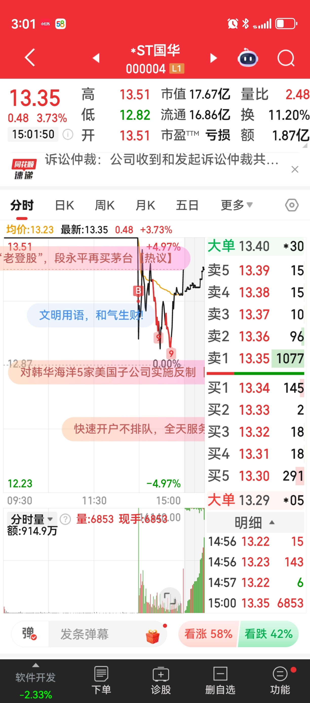 $*ST国华(SZ000004)$ 3点钟6853手,这是?