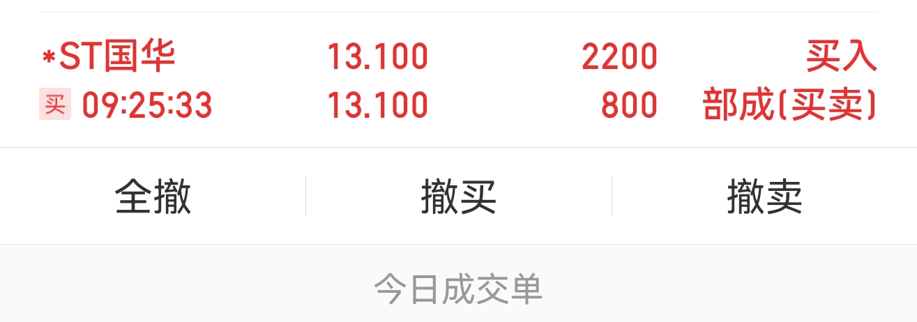 $*ST国华(SZ000004)$ 男人的第六感真的太准了,我今天第一次建仓,9.25后思考了33秒,咬咬牙跺跺脚。拿出一年的工资。挂单13.10,没想到成交到了且是今天最低价,还有1400股主力不砸了,不然我可以吹牛好多年了。今天赚了我1个礼拜的生活费,加油。