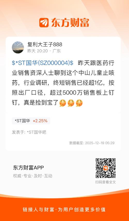 $*ST国华(SZ000004)$ 昨天跟医药行业销售资深人士聊到这个中山儿童止咳药,行业调研,终短销售已经超1亿,按照出厂口径,超过5000万销售板上钉钉,真是捡到宝了