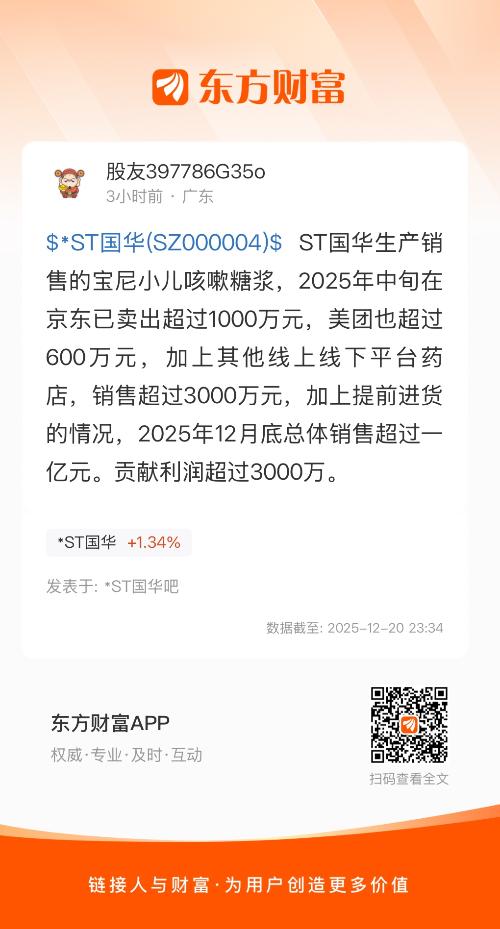 $*ST国华(SZ000004)$ ST国华生产销售的宝尼小儿咳嗽糖浆,2025年中旬在京东已卖出超过1000万元,美团也超过600万元,加上其他线上线下平台药店,销售超过3000万元,加上提前进货的情况,2025年12月底总体销售超过一亿元。贡献利润超过3000万。