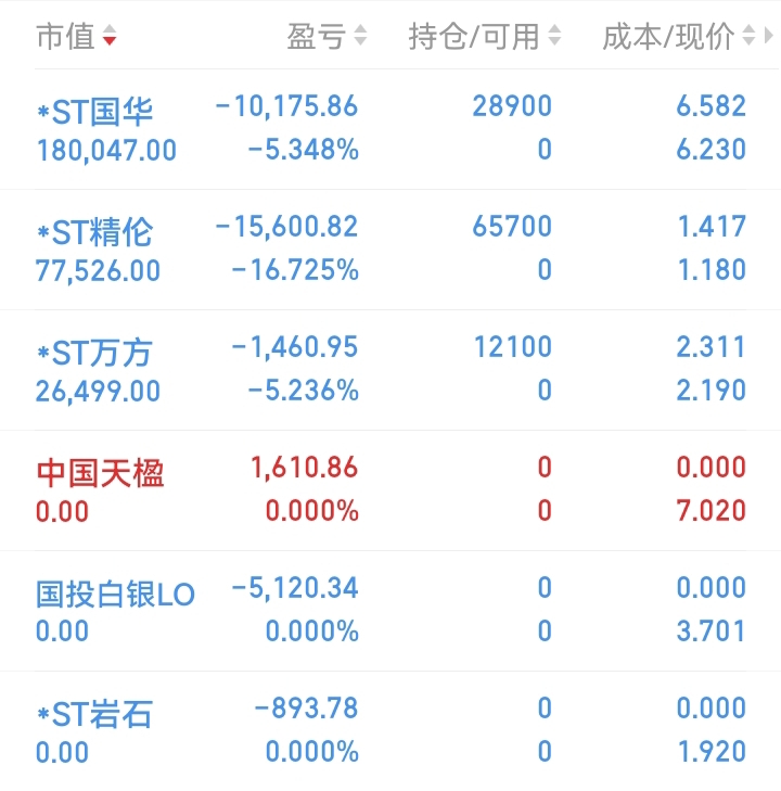 $*ST国华(SZ000004)$ $*ST岩石(SH600696)$ $*ST万方(SZ000638)$ $*ST精伦(SH600355)$ 亏得都不想吃饭了!牛市买了ST股全部吃地板!