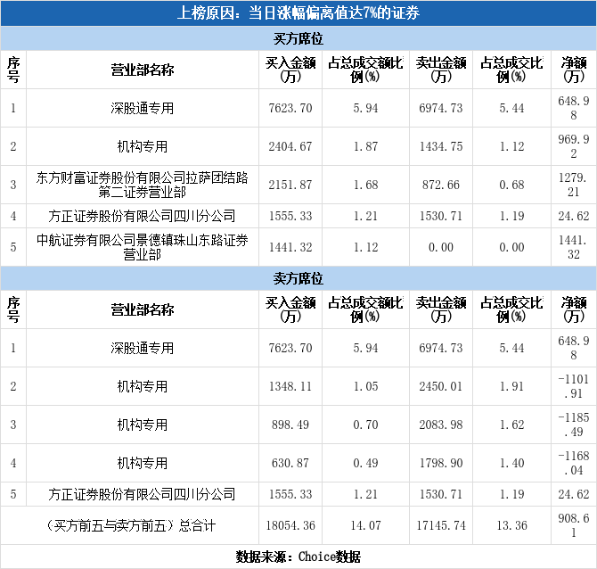 今日龙虎榜单上出现了深股通的身影,占据了买一、卖一的位置,净买入648.98万元,占当日成交总额的0.51%。