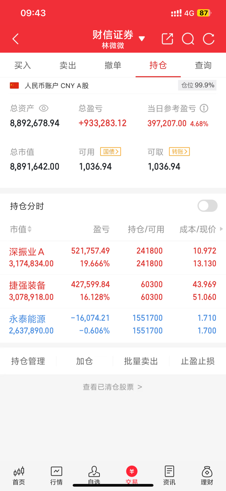 继续持有,$深振业A(SZ000006)$ $捷强装备(SZ300875)$ $永泰能源(SH600157)$ 这三支具备增长潜力,我满怀期待,相信随着后续市场的发展,达成盈利目标。