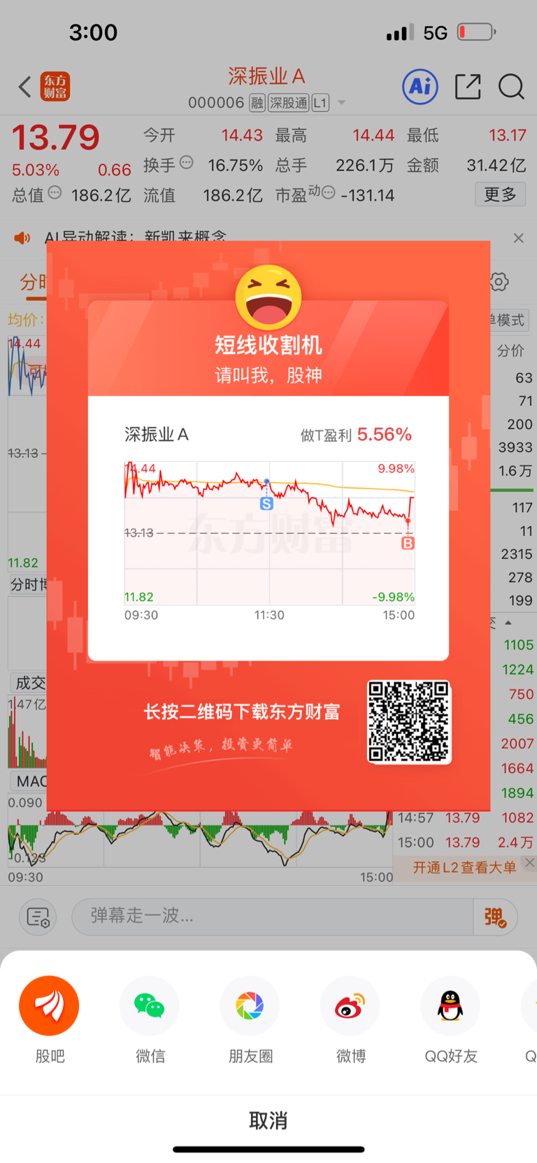 $深振业A(SZ000006)$ 14.12全仓卖出,13.36接回来半仓,现在成本几毛钱,你就给我三个跌停我都不慌。