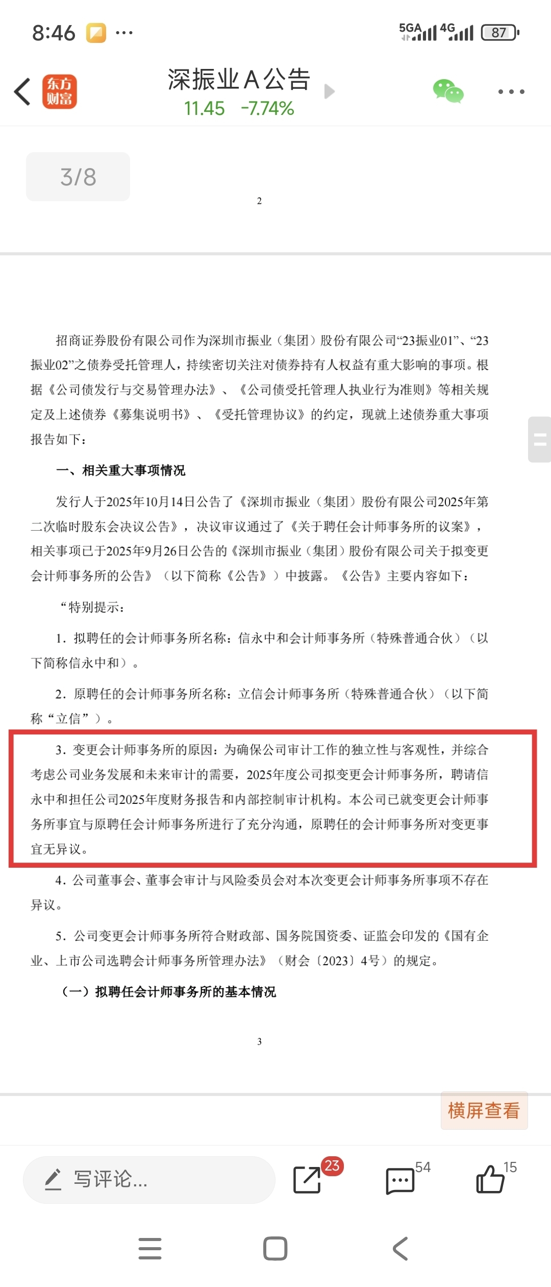 $深振业A(SZ000006)$ (为确保公司审计工作的独立性与客观性,并综合公司业务发展和未来审计的需要),主要是因为公司业务发展和未来审计的需要,已经很明朗了,这个是立信会计事务所做不到的,新的会计师事务所和未来业务发展有关,一个房地产业务肯定不需要这样