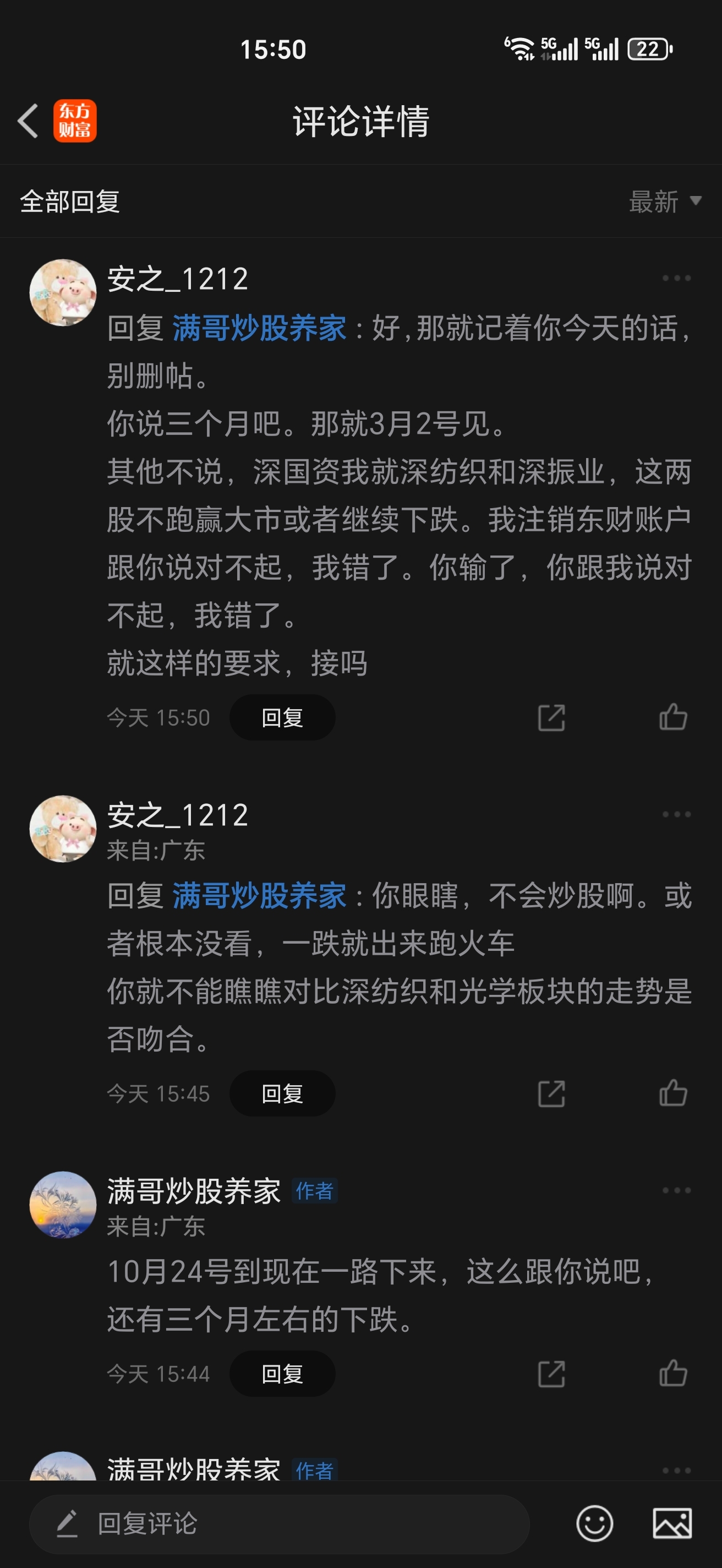 你在深纺织说还有三个月下跌。我说三个月后跑赢大市。我输了,我注销东财账户,跟你说