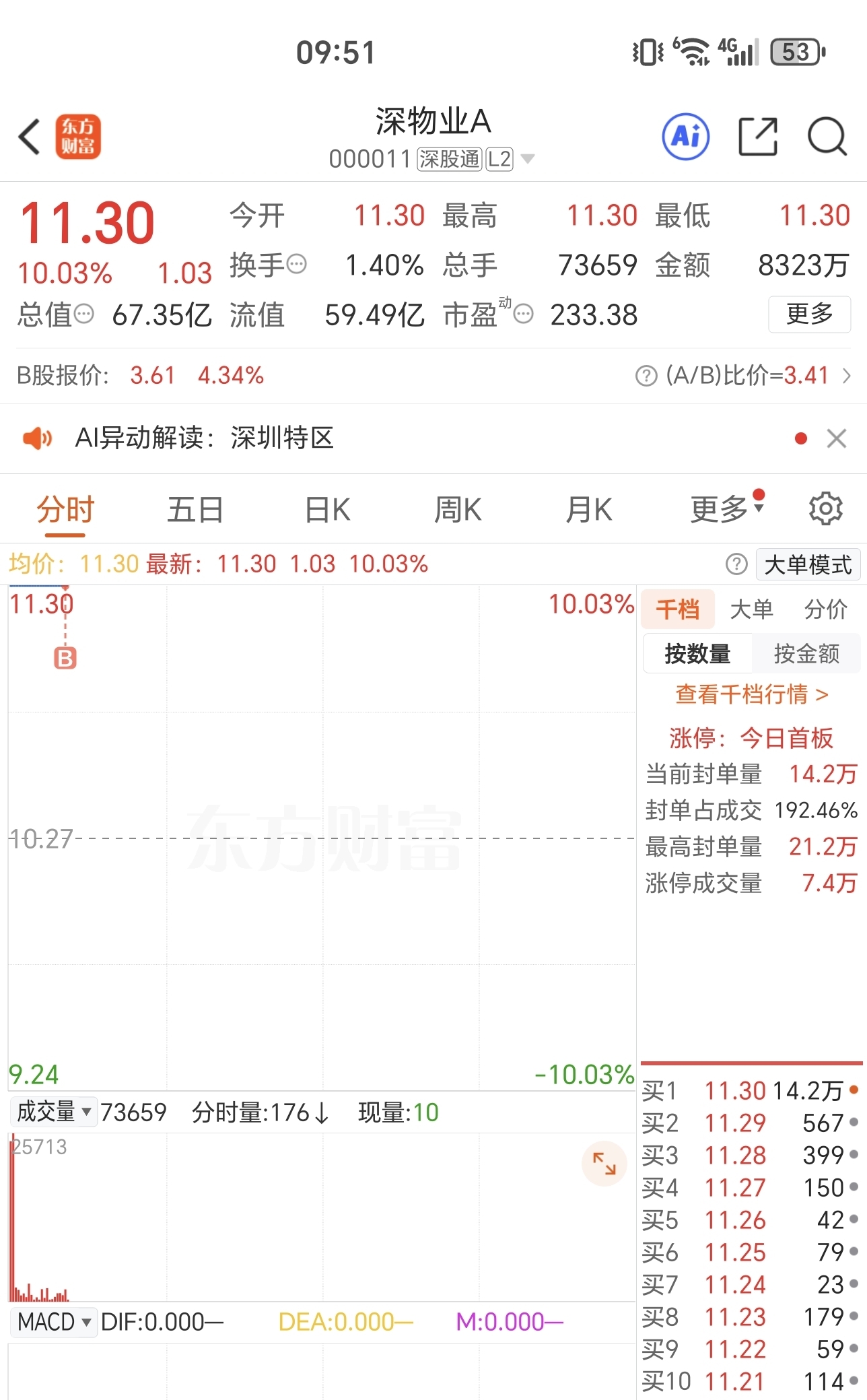 $深物业A(SZ000011)$ 早上9点挂的,居然排进去了。
