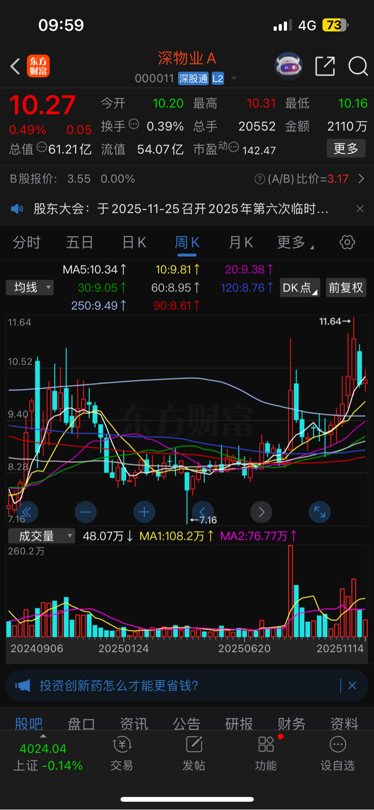 $深物业A(SZ000011)$ 周线级别来看,这周震荡,下周震荡如果这周下跌就是9.7附近接,如果收盘十字形就是9.9附近