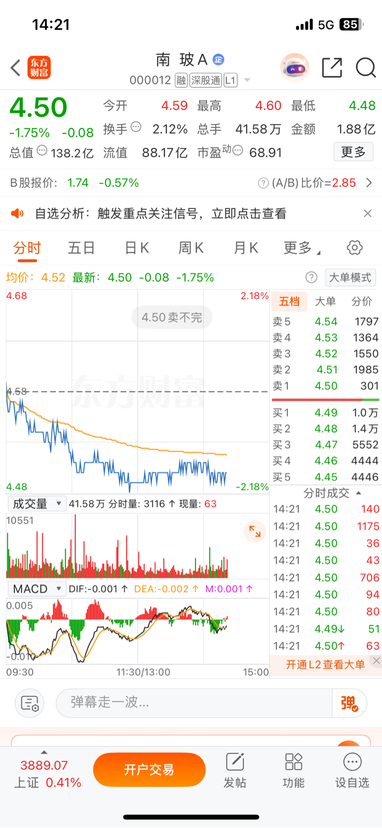$南 玻A(SZ000012)$ 卖不完的4.5-4.51,下面两个万手和5555单就是吸引散户进场或跟挂,时间差不多就是砸掉送给散户。都决定逆势砸盘肯定有原因的收盘就知道了