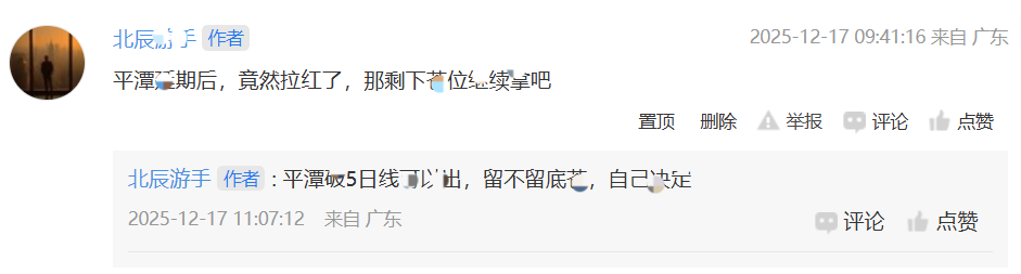 平潭发展:最终还是被延期了,但低开幅度不大,并且一度冲红,说明资金即使要出货,也需要震荡空间。所以,盘中北哥给的策略就是不破5日线可以格局,破了就走,当然你留少量苍继续博也没问题,毕竟吃禸吃到不在乎它是否地板的地步了,这时大家的心态应该是两个字:从容。$平潭发展(SZ000592)$