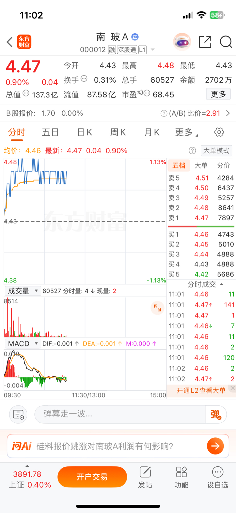 $南 玻A(SZ000012)$ 分时图已经背离了,下跌是时间问题当4.46被一笔或几笔砸掉预示反抽结束了