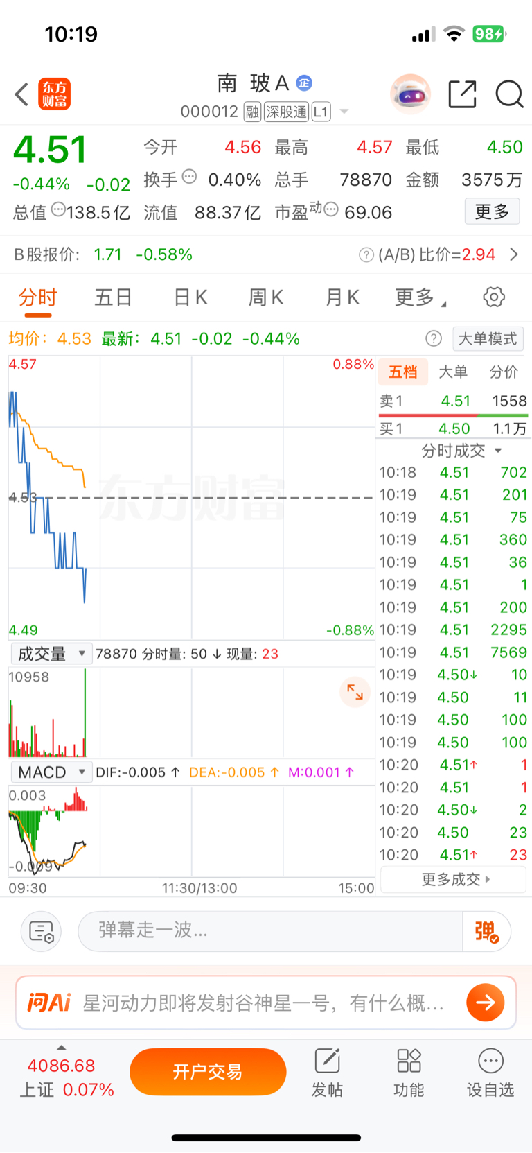 $南 玻A(SZ000012)$ 分时均价线45度下跌没有任何反弹迹象,决心很大啊。呵呵