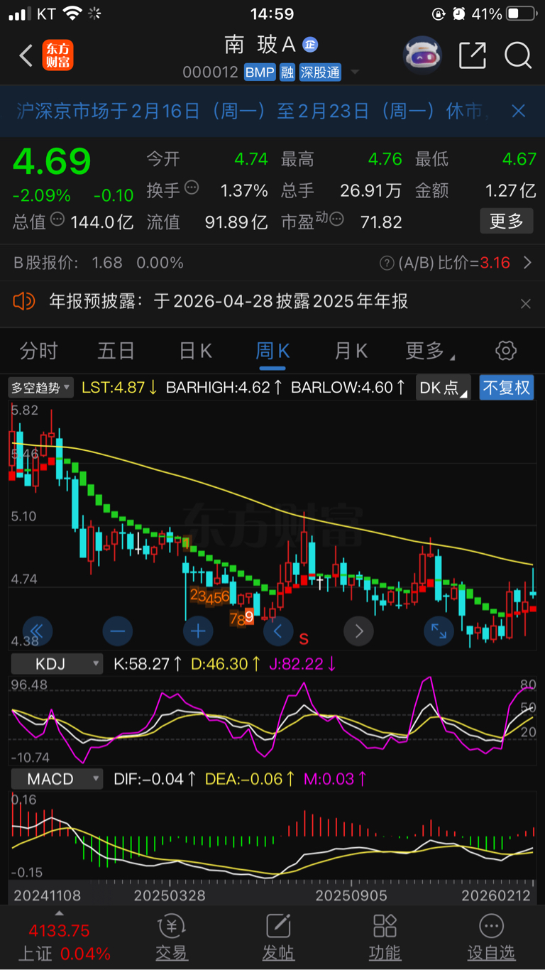 $南 玻A(SZ000012)$ 看周图,前两天4.85已经是这一波的高点了,又开始一波下跌,下跌中不言底,先看4.45有没站稳,留血汗钱过个好年,年后会有好价格的