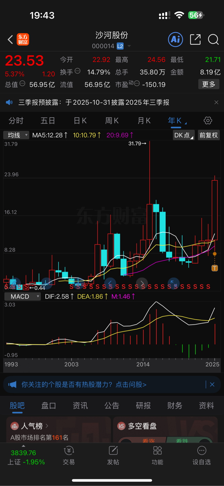 $沙河股份(SZ000014)$ 今天的意义在于创造历史,自1992年上市以来,虽然不是历史最高价,但是超过了23年来任何一年的收盘价,昨天也是创造10年新高,突破10年箱体。