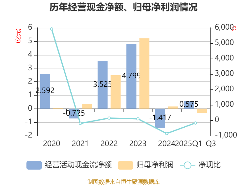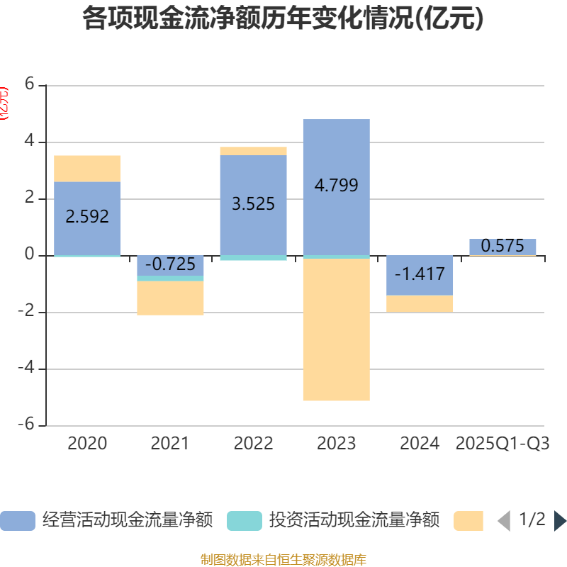 2025年前三季度,公司经营活动现金流净额为5751.49万元,同比增加1.6亿元;筹资活动现金流净额-352.93万元,同比增加5288.06万元;投资活动现金流净额-8.2万元,上年同期为-66.95万元。