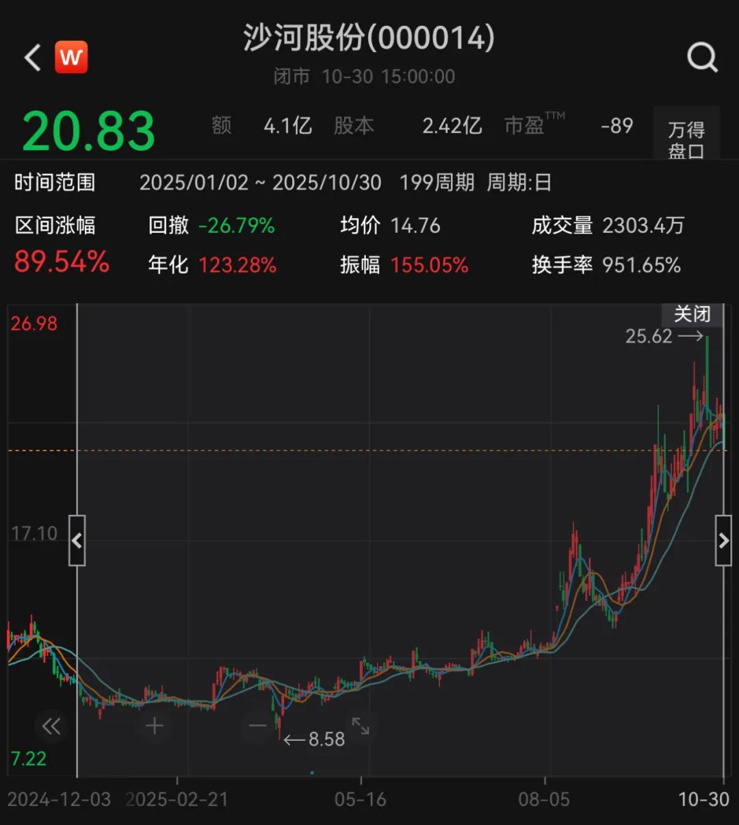 Wind数据显示,10月30日,沙河股份收报20.83元/股,最新市值为50亿元。该股于4月9日触及今年以来最低点8.58元/股,4月9日至10月30日该股累计涨幅为123.74%;今年以来,该股累计上涨89.54%。