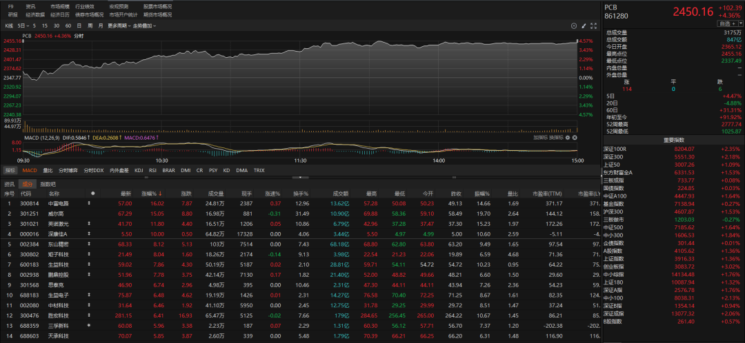 PCB板块近两个交易日持续走强,其中10月21日的收盘涨幅达4.36%。当日,深康佳A涨停,中富电路涨超16%,威尔高涨超15%,英诺激光涨近12%,东山精密、矩子科技、生益科技等均涨幅靠前。而此前一个交易日,板块中的亿道信息、晨丰科技涨停,东山精密、景旺电子盘中一度涨停。
