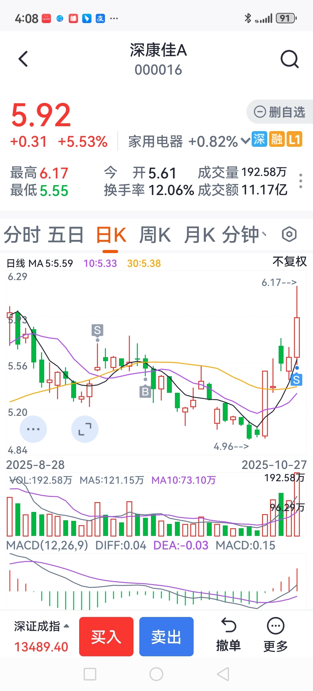 上次冲高卖出后,9月22日跳水买入,可悢的是操盘手连续砸盘到4.8元,太坏了!坚决不割肉,上周二涨停板,周三马上回调,今天庄家给我发工资!