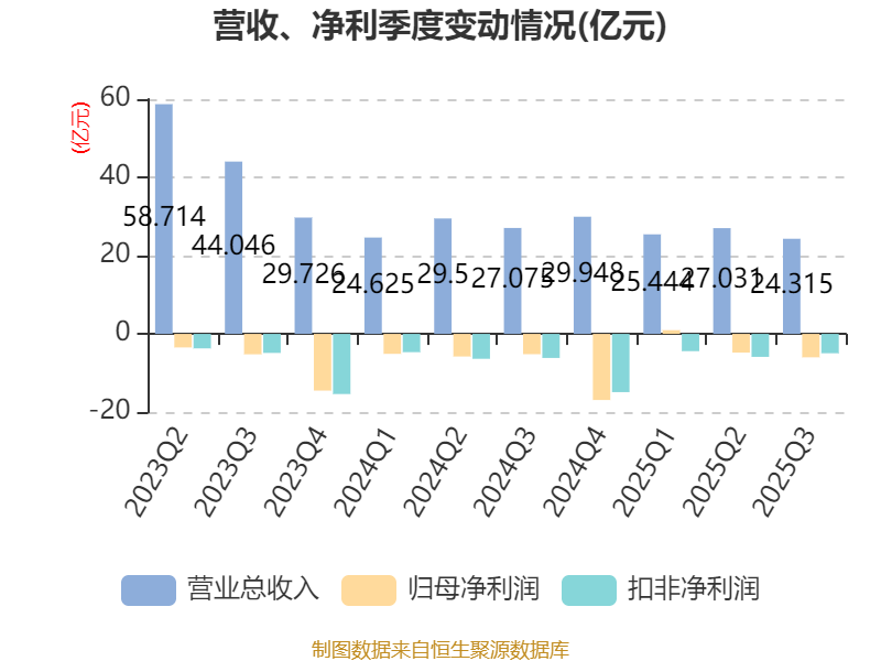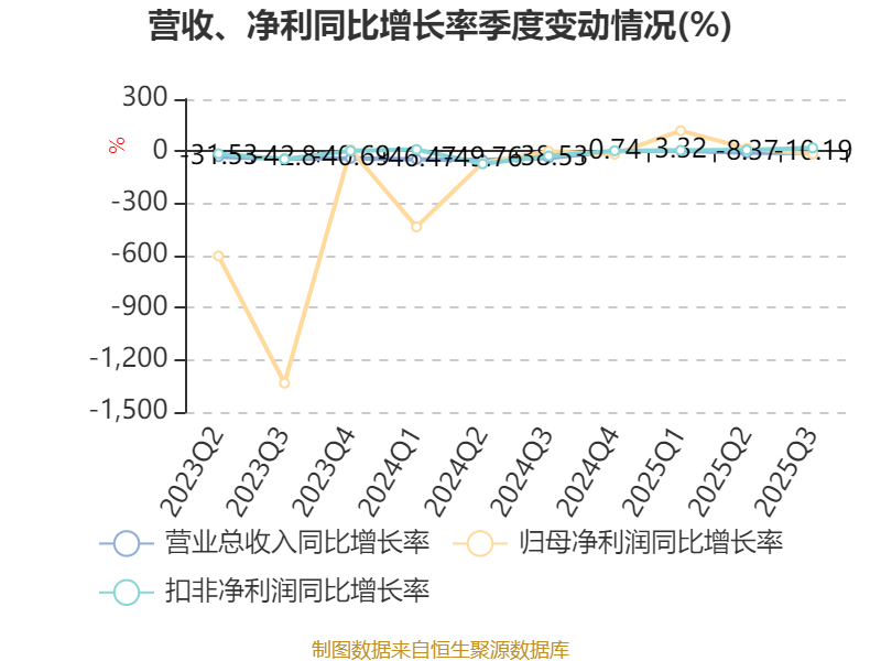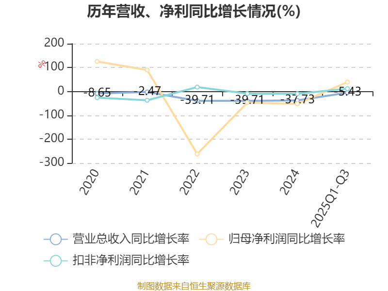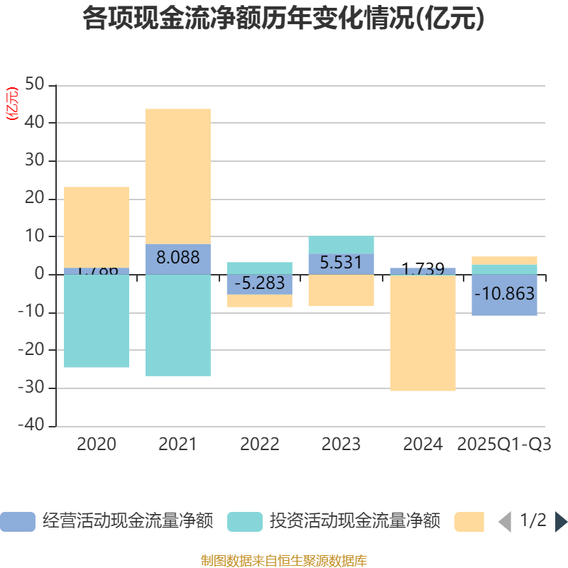 2025年前三季度,公司经营活动现金流净额为-10.86亿元,同比减少6.95亿元;筹资活动现金流净额2.11亿元,同比增加23亿元;投资活动现金流净额2.66亿元,上年同期为-3.82亿元。