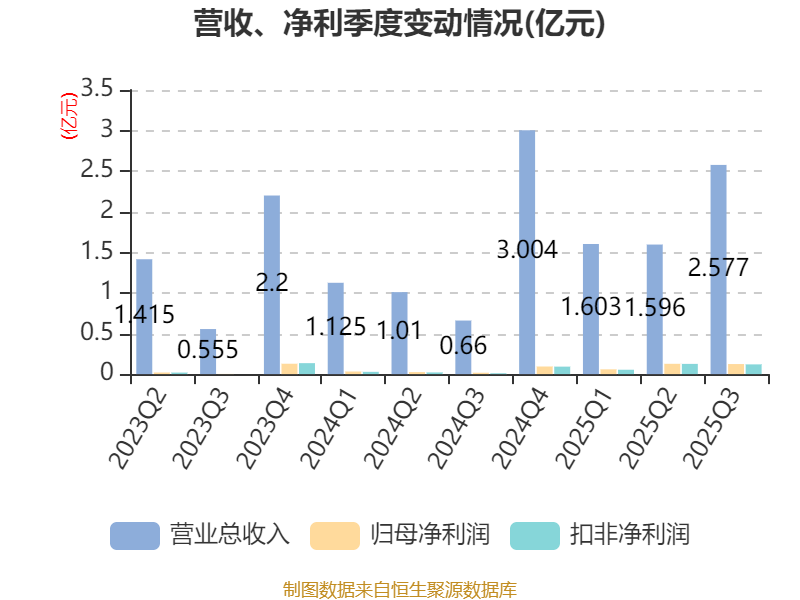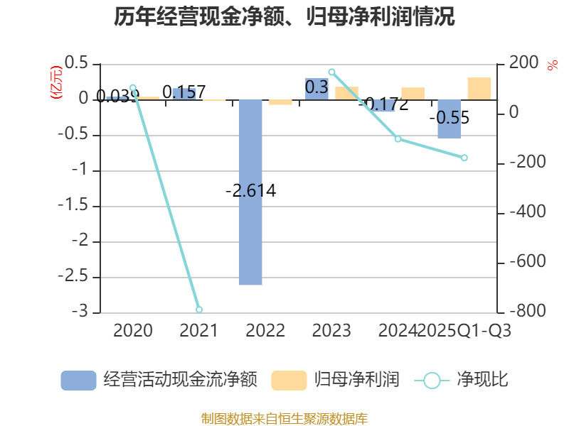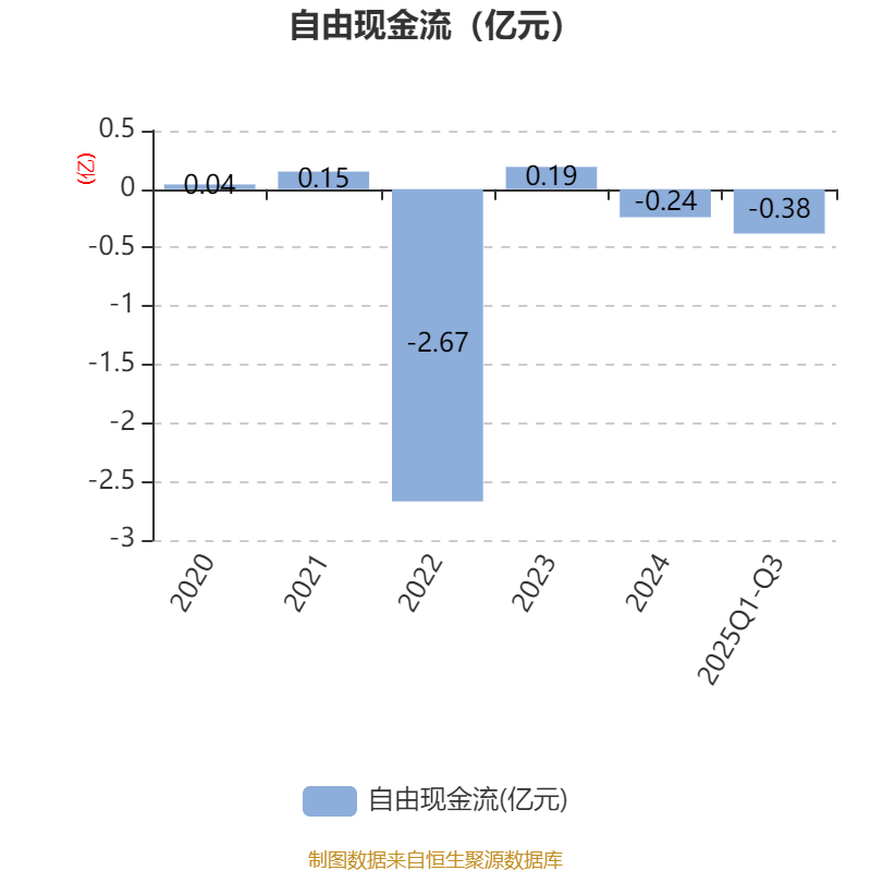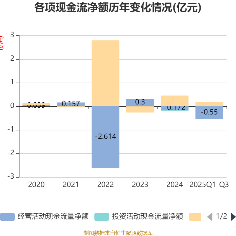 2025年前三季度,公司经营活动现金流净额为-5501.35万元,同比增加397.7万元;筹资活动现金流净额1654.12万元,同比减少530.69万元;投资活动现金流净额-2.03万元,上年同期为-127.96万元。
