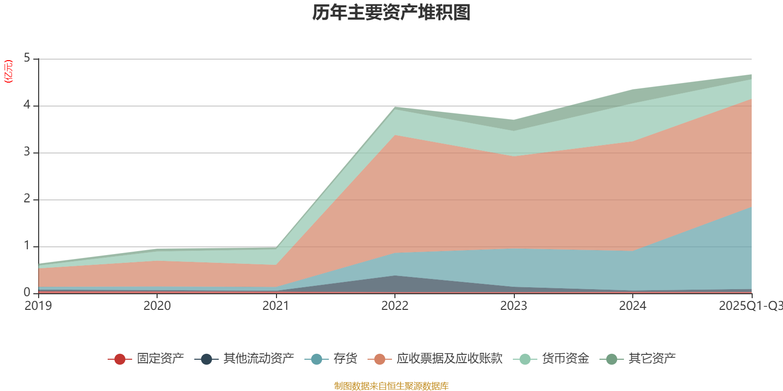 资产重大变化方面,截至2025年三季度末,公司存货较上年末增加107.55%,占公司总资产比重上升18.11个百分点;货币资金较上年末减少48.23%,占公司总资产比重下降9.65个百分点;应收票据及应收账款较上年末减少1.46%,占公司总资产比重下降4.43个百分点;其他应收款(含利息和股利)较上年末减少95.41%,占公司总资产比重下降4.16个百分点。