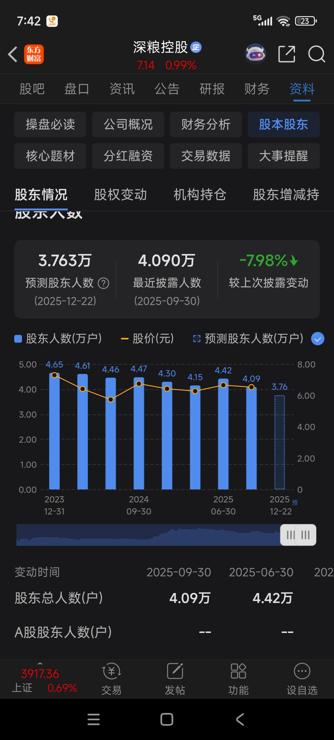 我发现一个问题,股东人数一直在减少啊,上次7块8以来,散户不但没有增多,反而减少