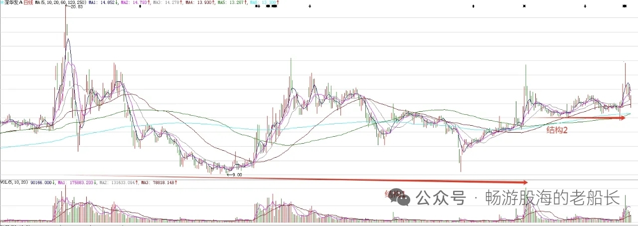 。图中标注的大型结构1突破,意味着股价处在比较大的上涨趋势。结构2是结构1突破后的回踩,意味着波段上涨在即。