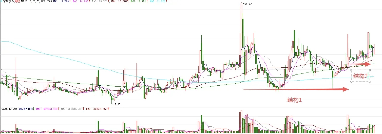 周线级别的走势来看,图中标注了一个大型的中枢结构1,是底部形态突破后的回踩,结构