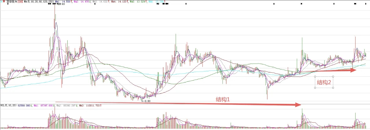 最近两个交易日,连续调整,但是幅度不大,这是近期构筑了结构3突破后的回踩。周期面来看,今天是第五个有效周期,到了变盘节点,所以,调整大概率要结束了。图中标注的大型结构1突破,意味着股价处在比较大的上涨趋势。结构2是结构1突破后的回踩,意味着后期有波段上涨。接下来,新的波段上涨要开始了。