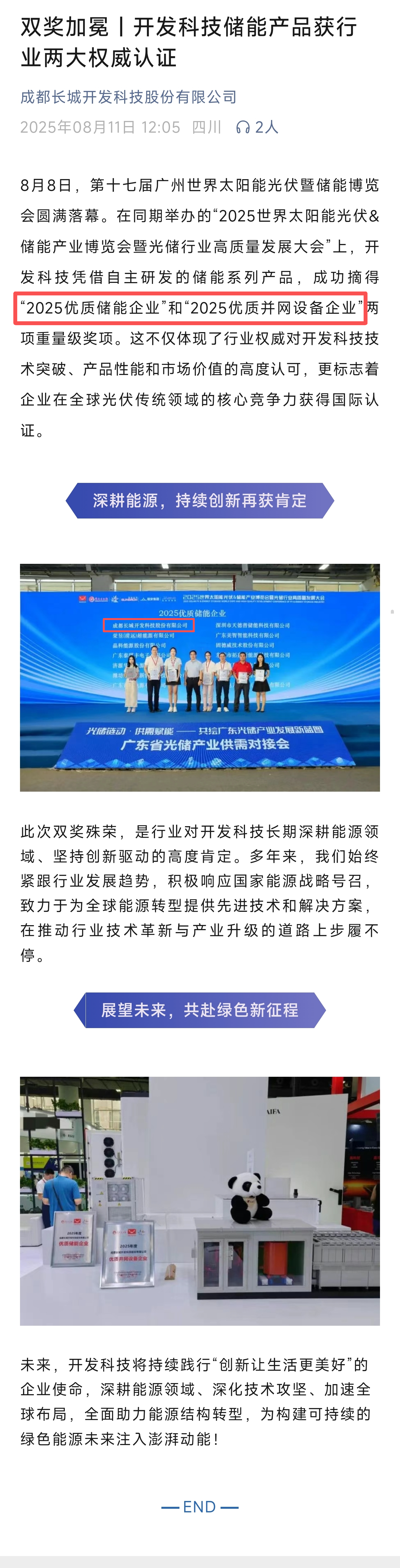 “2025世界太阳能光伏&储能产业博览会暨光储行业高质量发展大会”上,深科技实控子公司开发科技(920029)凭借自主研发的储能系列产品,成功摘得“2025优质储能企业”和“2025优质并网设备企业”两项重量级奖项。