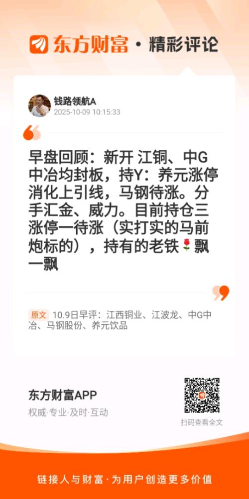 //@钱路领航A :早盘回顾:新开 江铜、中G中冶均封板,持Y:养元涨停消化上引线,马钢待涨。分手汇金、威力。目前持仓三涨停一待涨(实打实的马前炮标的),持有的老铁飘一飘 $深科技(SZ000021)$$合锻智能(SH603011)$$永鼎股份(SH600105)$