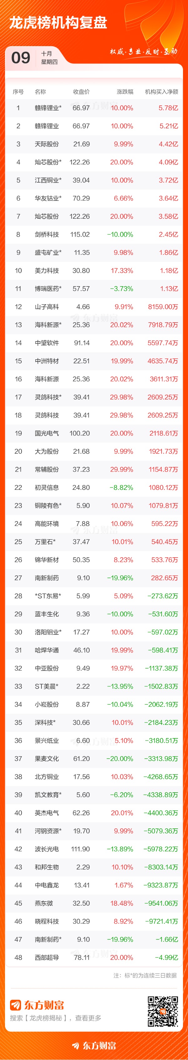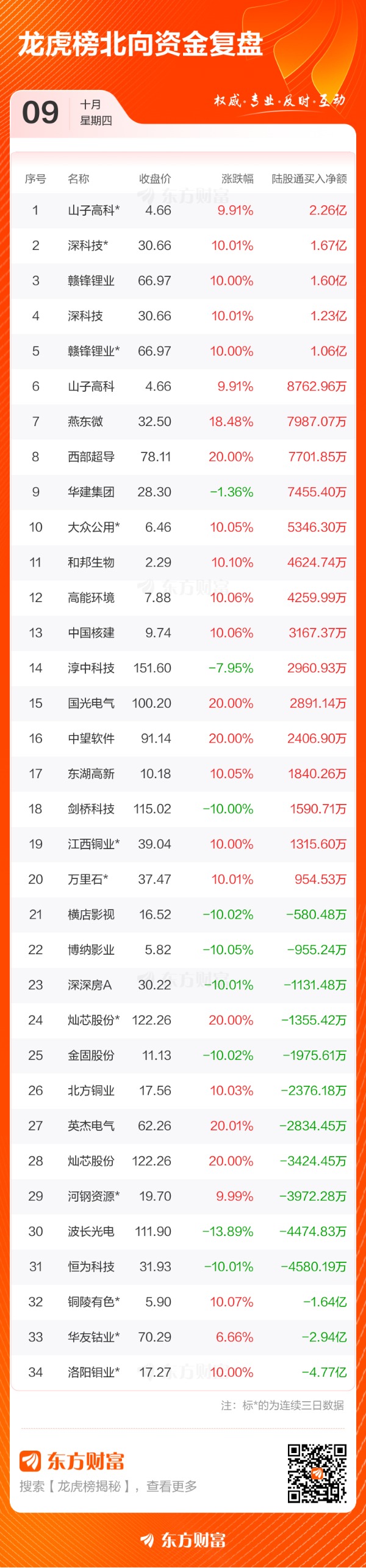 10月9日共有65只个股上榜龙虎榜,总上榜成交额216.32亿元。上榜个股中净买入额最高的是深科技,金额为8.02亿元。