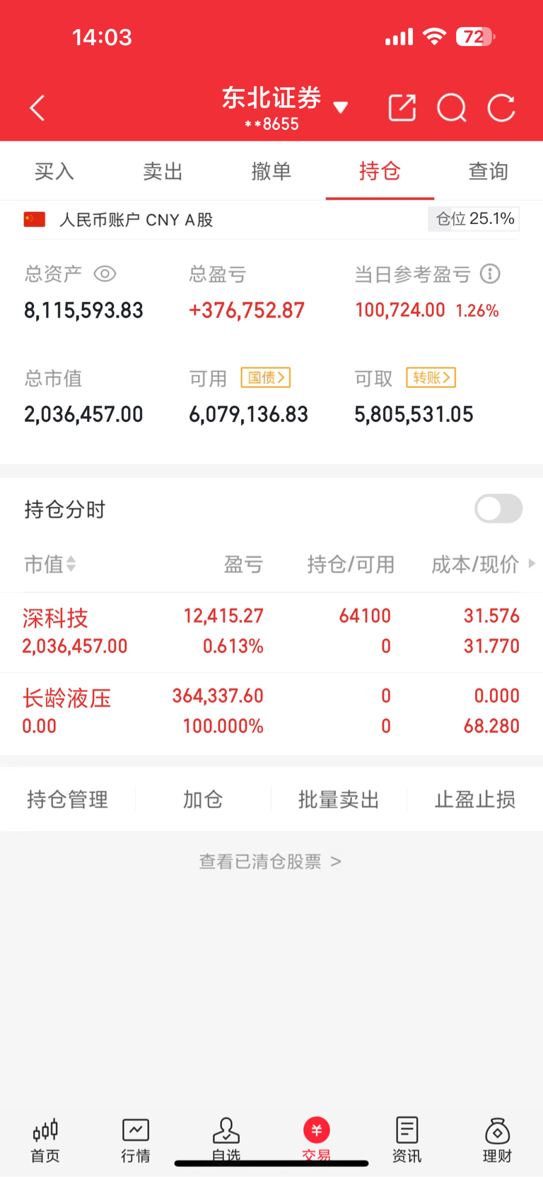 今日持仓记录长龄液压出局,今天开仓深科技,期待接下来继续吃肉。看(WB)深圳板哥