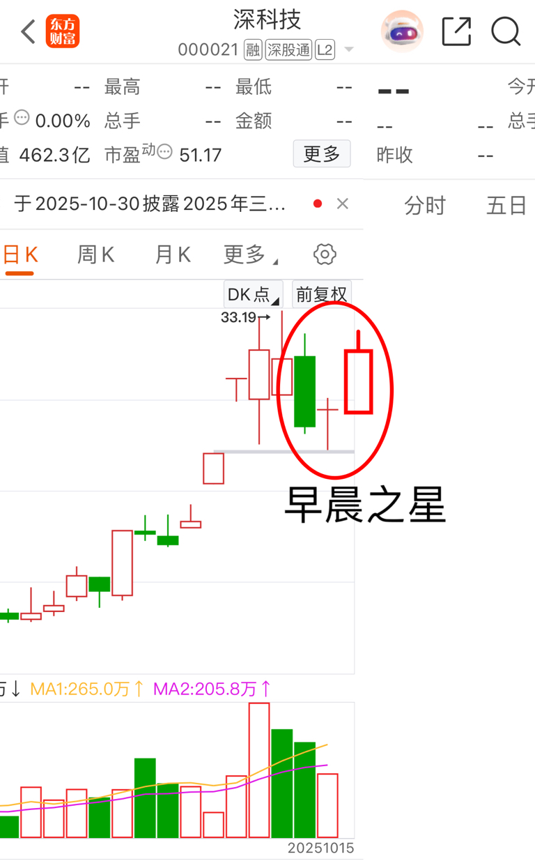 $深科技(SZ000021)$ 今天怎么走?收7点长阳线!形成“早晨之星”多头趋势