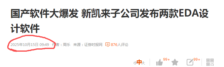 华大九天:昨天说了追这票的理由一个是位置低,一个是新凯来发布拥有完全自主知识产权的全国电子工程EDA设计软件,性能只能说非常的棒,这种都不带犹豫的,先上了再说,错了就割,消息刺激的票就是要果断,犹豫就会败北。有股友提到说不知道哪里看弹出来的消息,这东财本身就有的呀,特意再去找了一下这个消息,你看看这个时间就知道了。