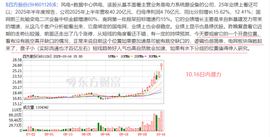 四方股份;数据中心供电+电源设备、四方股份是今天早评日内潜力,早上开盘强势,直接跳空高开,分歧后开始转强。股价转强应该还是受电网板块影响的,阳光电源作为行业龙头今日大涨7个多点,保全了指数同时还稳定了个股情绪,马哥认为上午是多重因素共振引发紫金对四方股份封板,所以盘中判断可以寻找B点(BS点,懂的都懂)