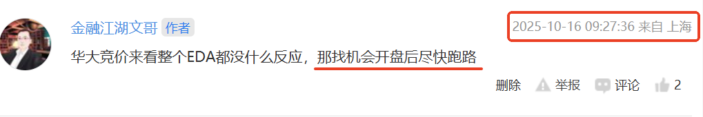 华大九天:竞价一出来我就在评论区说了,EDA整个板块都没表示,说明昨天是一阵风,那今天开盘就必须尽早解决掉,文哥号称快男,一分钟不到跑路了。究其原因还是因为不及预期,昨天消息出来拉升了,也就板块效应,但是偏弱,驱动不够,今天再度低开基本说明板块希望不大了,说没有一丝一毫留恋,直接跑路。