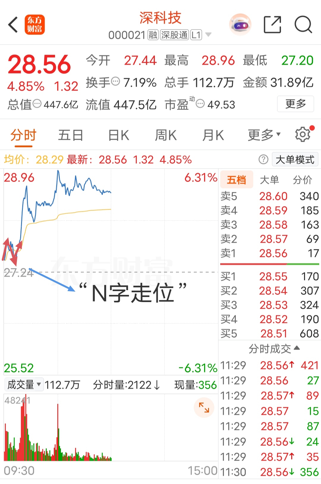 高开,正“N”形的分时走势。N”型走势出来,说明开盘后股价遭遇抛压,但随即又被买