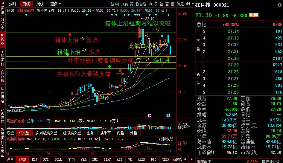 昨天大跌之后,问题来了,27元附近到底是不是箱体下沿?10月20号,股价跌到两次26.9元后获得支撑,昨天的最低价是27.20元,下星期一如有惯性下跌就看26.73元支撑位,能不能支撑的住,如果大盘主力机构强势打压指数,深科技有可能回补25.98元之缺口,如果这样股价短期超跌,从而引发股价强势反弹。再一个就是昨天股价跳空下跌,留下一个0.37元的跳空缺口,这个缺口迟早会封闭,所有当前调整时不必割肉,这个缺口的上沿是29.16,反弹阻力位在28.8元附近,估计其极限调整位不会跌破9月24日的25元。