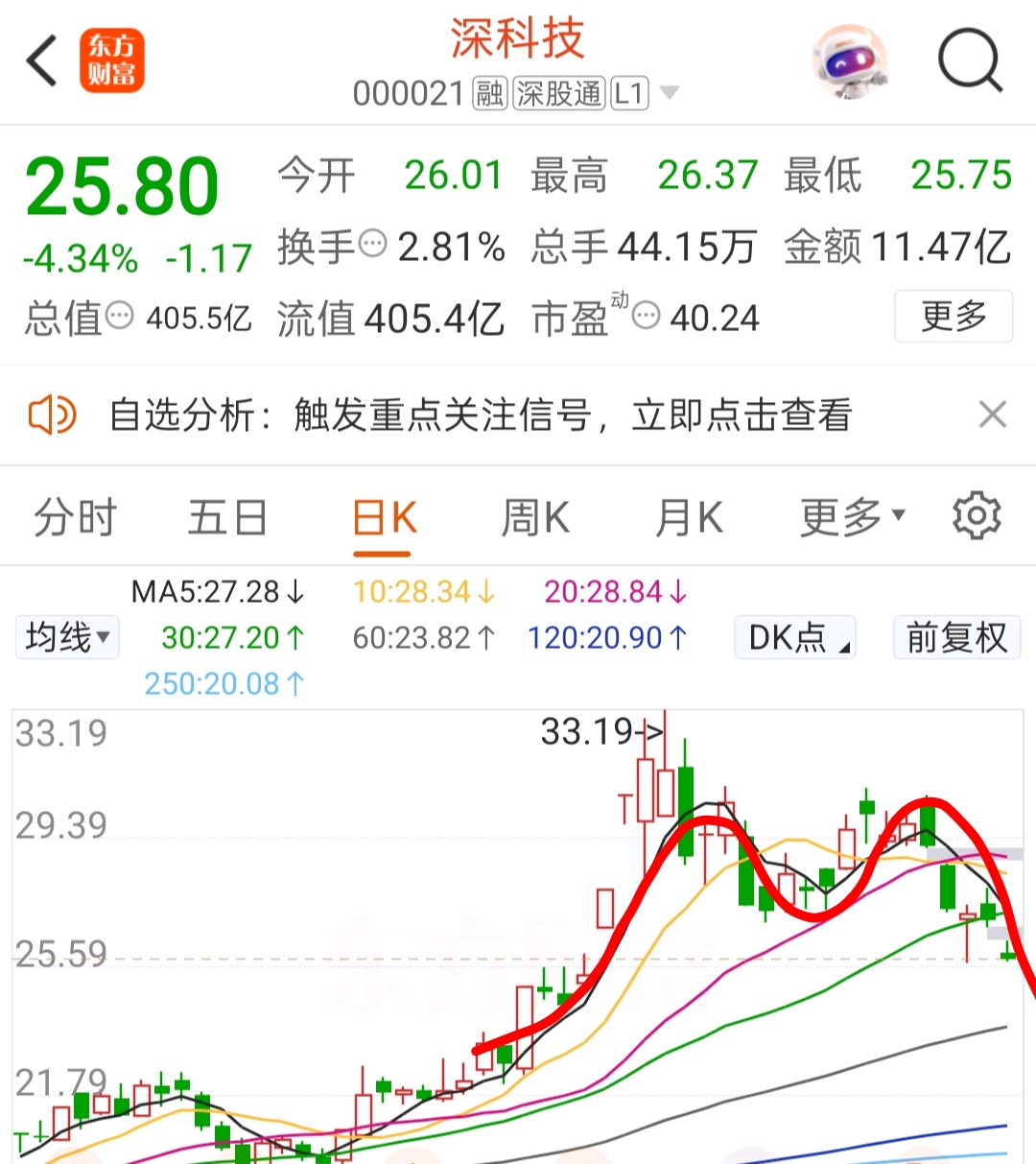 $深科技(SZ000021)$ M头,资金连续大幅流出,三四天跑了十几个亿了,绝对的大级别出货。今天依然是大幅流出,没有一丝回流迹象,还得跌,至少20元。