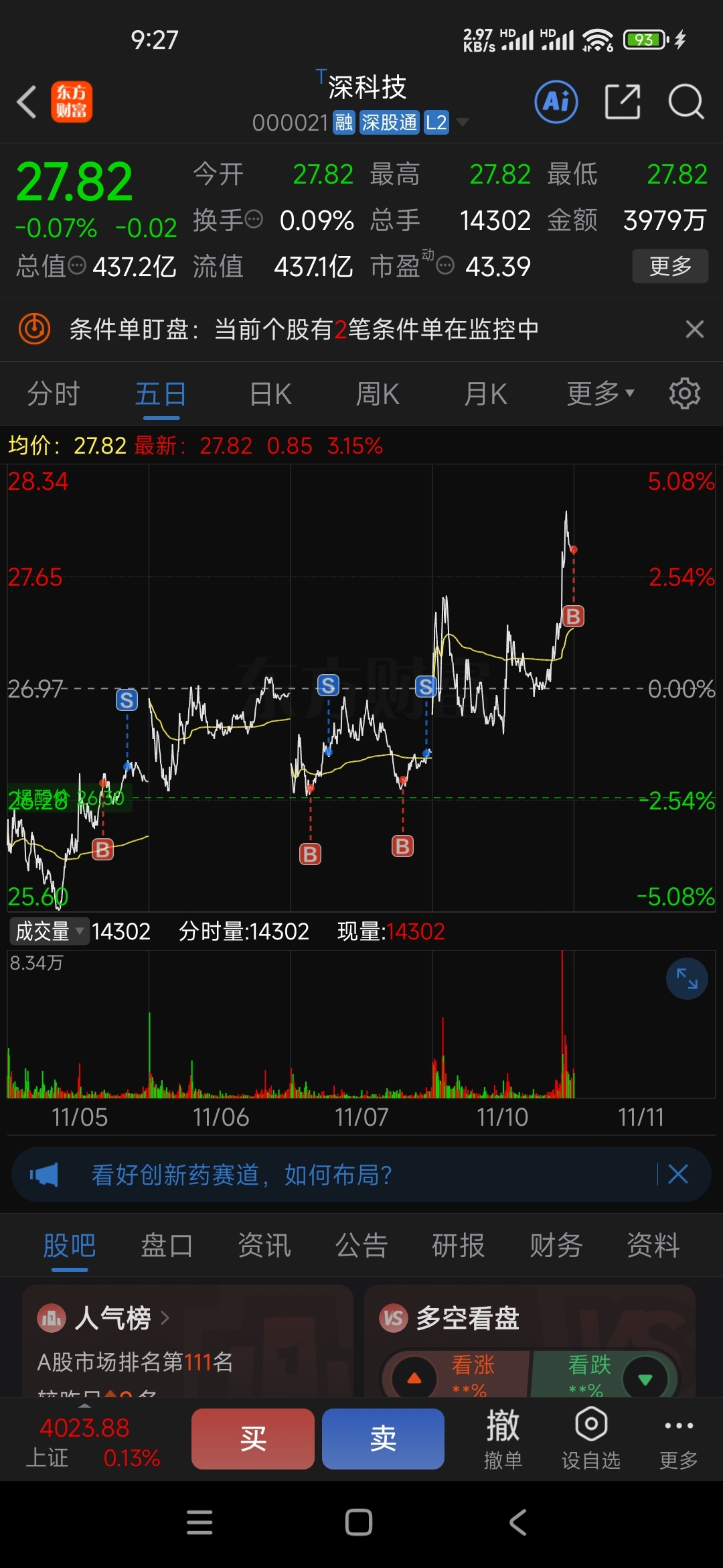 $深科技(SZ000021)$ 只在低位T,今天以为突破了,加了一100股,结果买跌了,只要我一看涨准跌,只要我一卖她必涨,看来明天我为了股价上涨要卖100股,谁接?