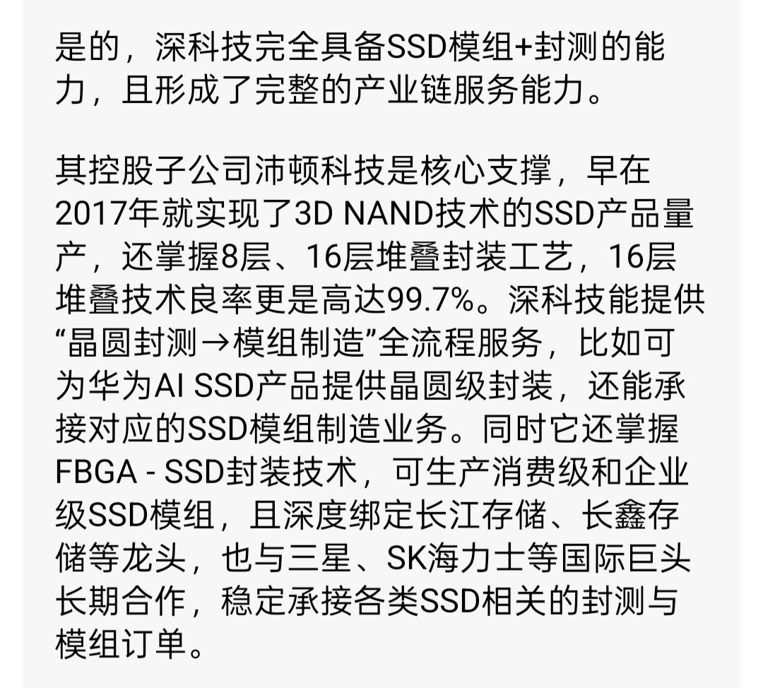 $深科技(SZ000021)$ 三星计划停产SATA SSD,应该是利好深科技的,深科技不光有企业级SSD封测能力,还生产其模组。市场占有率相当高,一旦三星停产,国产替代,深科技凭借对SSD的 模组'+封测,是巨大受益者。