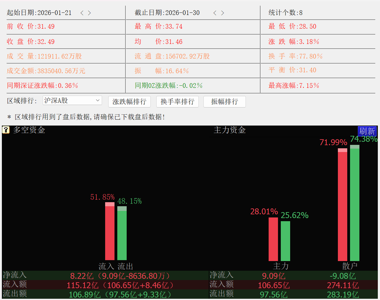 1月21日~30日,共8个交易日,股价基本属于横盘,但多空资金净流入8.22亿