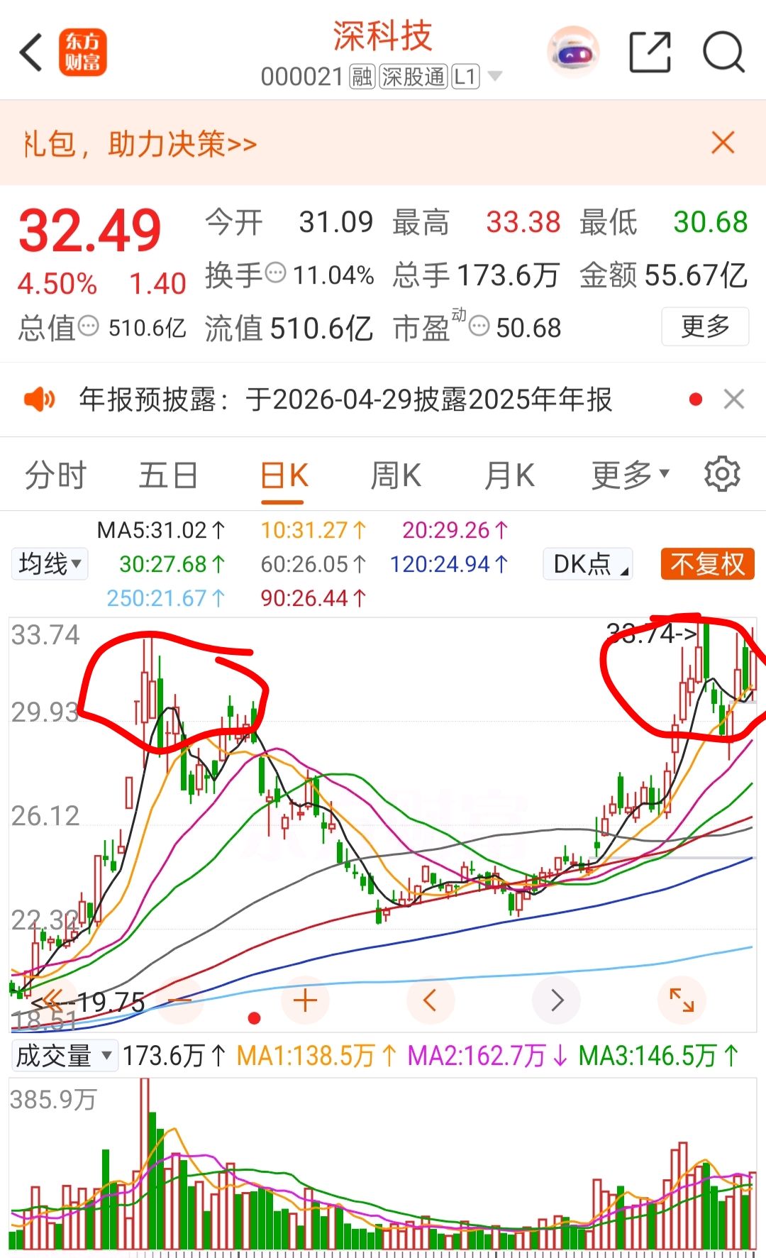 下周深科技该选择方向了,经过一个月的充分换手,解放了去年10月份的套牢盘,大概率要拔新高度了,40?50?60?